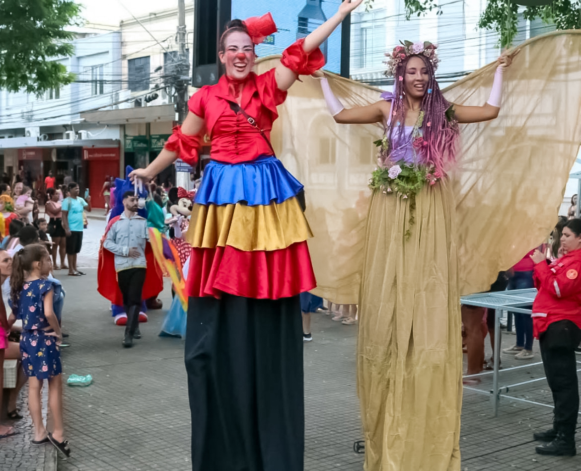 O festival começa em festa! Um cortejo animado pelas ruas da cidade com artistas em pernas de pau, palhaços e músicos do grupo de teatro Toca, convidando o público a mergulhar na magia do evento. É o chamado para a alegria, um espetáculo colorido e vibrante para todas as idades.