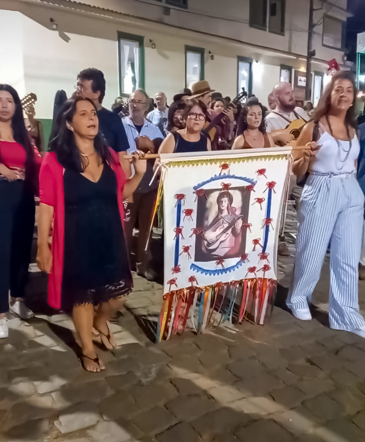 Um momento de fé e tradição. Violeiros da região caminham pelas ruas entoando modas antigas e canções das músicas de raiz. À frente, o estandarte com a imagem de São Gonçalo do Amarante, protetor dos violeiros, conduz o cortejo. Emoção, devoção e identidade cultural em um só passo.