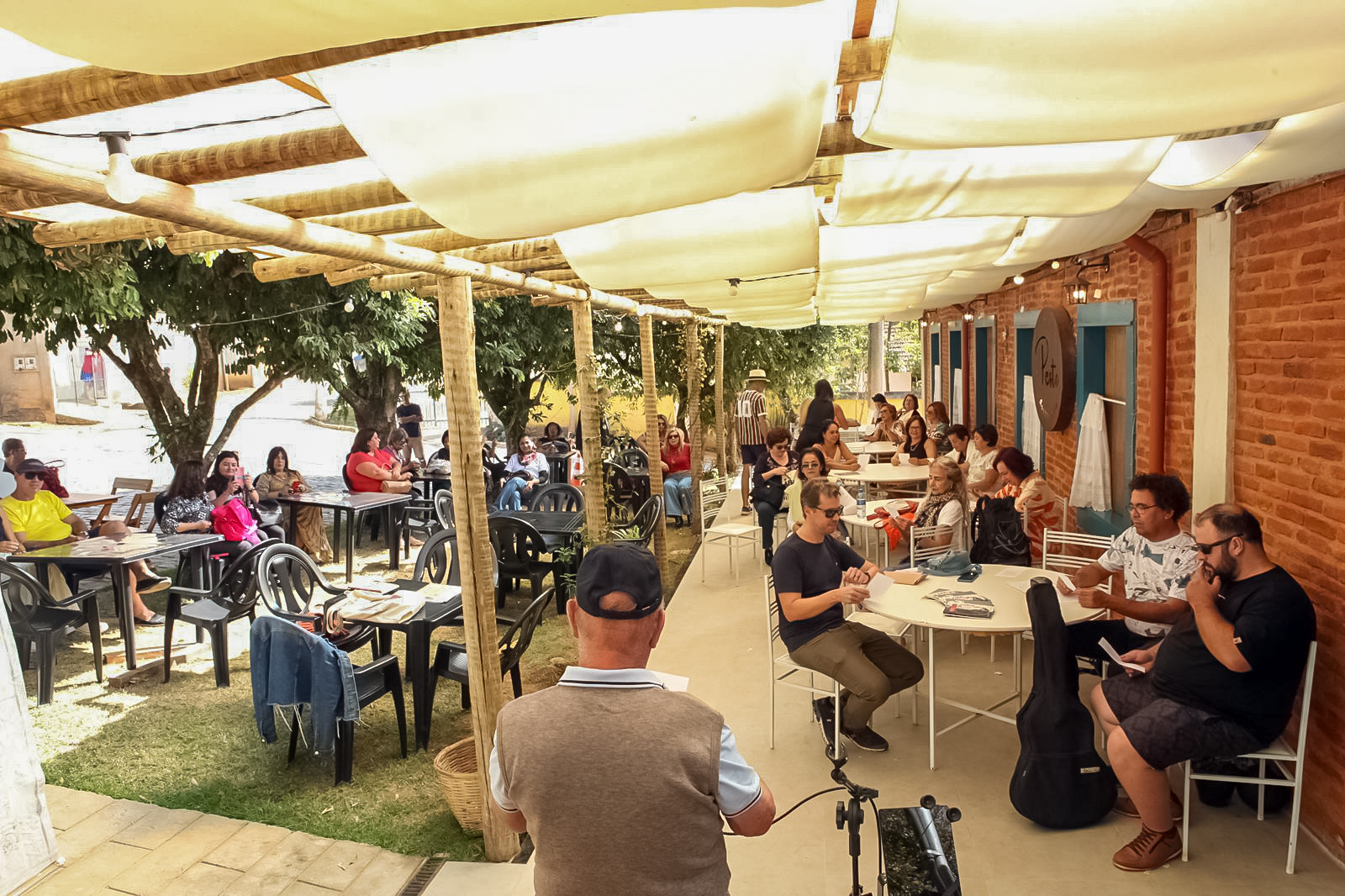 O Sarau de Poesias reúne artistas, escritores, músicos e amantes da arte para uma manhã de partilhas afetivas e criativas. Nesse espaço, cada participante pode ler ou declamar seus próprios textos, além de apresentar poesias, músicas e obras que admiram e que tocam seus corações. É um convite à escuta, à expressão e à conexão através da palavra e da música, em um ambiente acolhedor e poético.